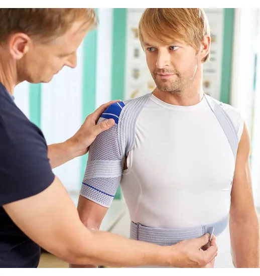 The Bauerfeind OmoTrain supports and stabilizes the shoulder, offering reliable guidance for smooth, controlled movement. Athletic shirt shown is not included.